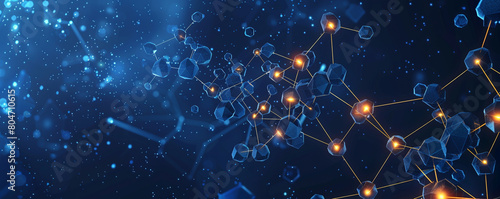 Starry navy background with intricate molecular polygonal networks each connection glowing to symbolize technological advancements in molecular science.