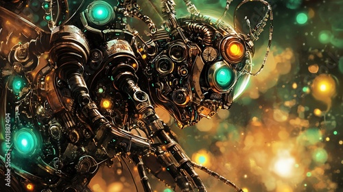 Steampunk insect robot, cosmic background, digital art, sci-fi concept