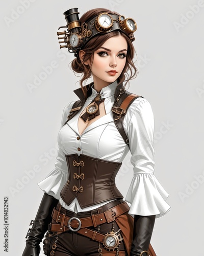 victorian, industrial, gear, brass, goggles, clockwork, corset, futuristic, vintage, adventure, innovation, elegance, brown, leather, lace, fashion, girl, woman, lady, fantasy, female, science, glamour, gorgeous, one person, suit, white, hat, illustration, cosplay, sexy, seductive, long hair, retro, sexual, punk, steam, beauty, model, black, person, face, style, warrior, coiffure, sensuality, gothic, posing