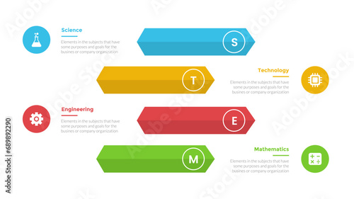 STEM education infographics template diagram with arrow rectangle stack with 4 point step design for slide presentation