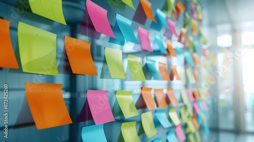 Sticky notes on a wall, glass meeting room backdrop, brainstorming in progress, colorful and vibrant, dynamic and focused scene
