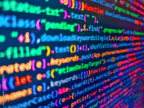 Stock market, forex, financial data. Programming software code on computer screen which develop by the programmer to solve the business requirement. Structured sql code on monitor.