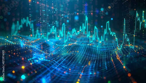 Stock market graph in blue and green colors on a dark background, showcasing financial analysis and planning with charts and graphs, set against an abstract digital backdrop to emphasize its role in b