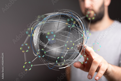 Stock photo of a man interacting with a futuristic holographic globe, representing global network and digital technology.
