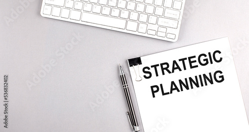 STRATEGIC PLANNING text on paper with keyboard on grey background