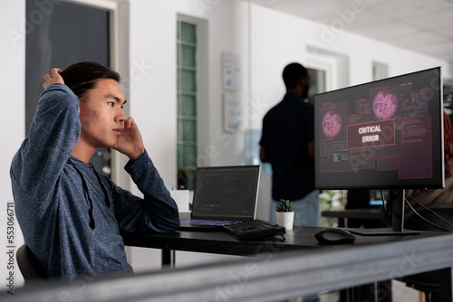 Stressed asian web developer having security breach alert on computer screen, trying to solve hacking and critical error. Programmer using terminal window and having system hacked crash.
