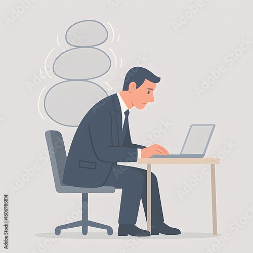 Stressed businessman with poor posture at desk, symbolic illustration of burnout, back pain and mental overload in modern work environment