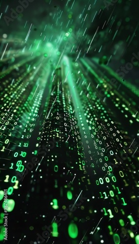 Striking abstract digital art of green binary code raining on a dark, mysterious background