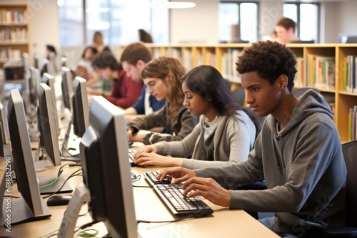 Students collaborate in computer lab. group project, laptops, teamwork, technology, knowledge sharing.