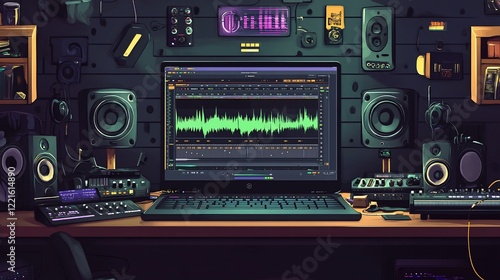 Studio Setup: Digital Audio Workstation with Monitors and Mixing Desk
