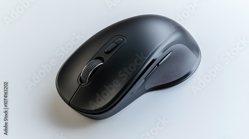 Studio shot of a black and grey ergonomic wireless mouse on a white background Features include a soft rubber grip scrolling buttons and a contoured design shown from above
