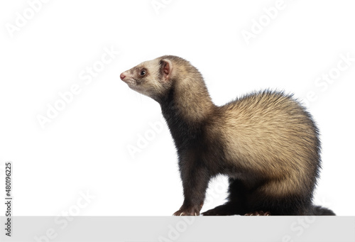 Studio shot of cute little white grey ferret isolated over white background. Concept of happy domestic and wild animals, care