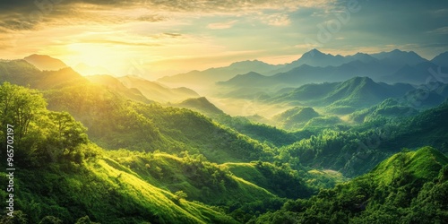 Stunning landscape of rolling hills bathed in golden sunlight, showcasing lush greenery and majestic mountains in the background.
