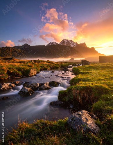 Stunning sunset over a mountain stream
