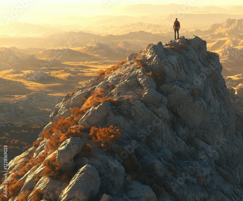 Stunning sunset view from rocky mountain peak by hiker