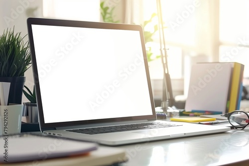 Stylish workspace with blank screen laptop computer, office supplies, houseplant and books at office. desk work concept.