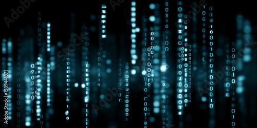 Stylized binary code glowing in vertical streams creating depth and futuristic visual effect