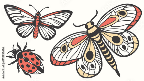 Stylized Butterfly Moth and Ladybug Vector Illustrations for Nature Education Garden Design and Whimsical Spring Summer Graphics