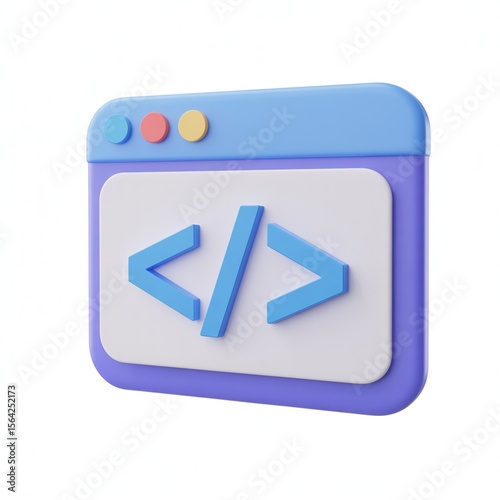 Stylized coding window with blue brackets, purple frame, colored buttons, white background, development, programming, code editor, software, tech UI.