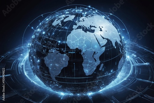 Stylized digital globe with blue light and connected lines