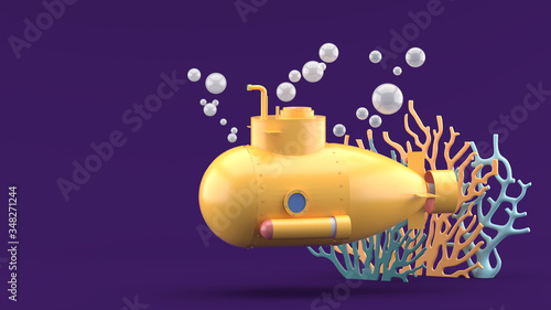 Submarines and corals surrounded by bubbles on a purple background.-3d rendering..