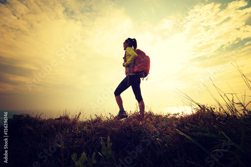 successful hiker walking on seaside mountain peak