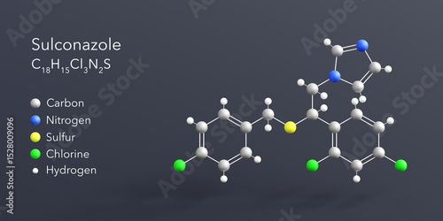 sulconazole molecule 3d rendering, flat molecular structure with chemical formula and atoms color coding