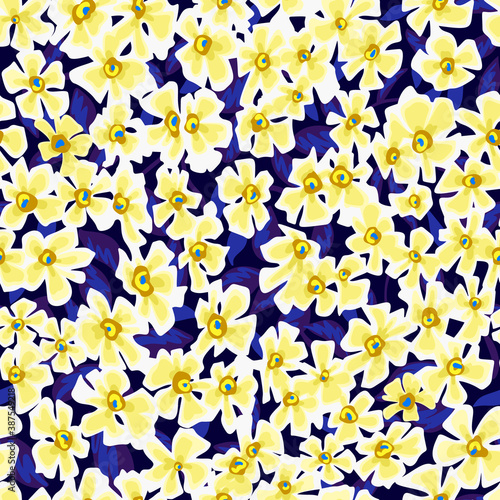Summer nature botanical illustration. Seamless pattern made of decorative daisy flowers. Ditsy meadow ornament. Simple floral background in vintage style. Good for fashion, fabric and textile.