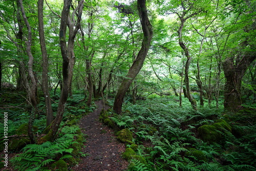 summer path through mossy rocks and old trees