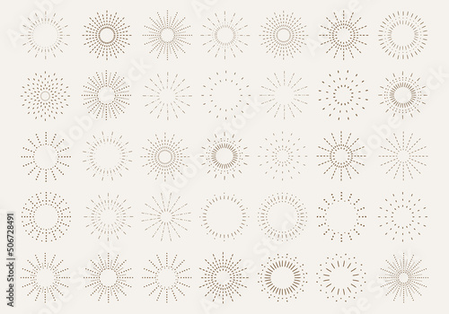 Sunburst set. Vintage sunrise collection. Vector light rays elements. Firework explosion, stars, emblem, logo, tag. Vector Illustration