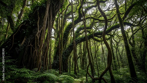 Sun-dappled Ancient Banyan Tree with Aerial Roots in Lush Vibrant Tropical Rainforest.