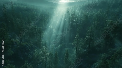 Sunlight Filtering Through Misty Green Forest Scenery Landscape Background