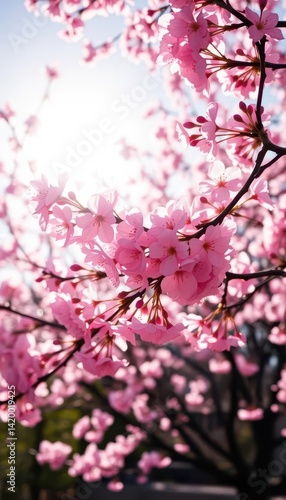 Sunlight illuminates delicate pink cherry blossoms gently swaying in a spring breeze, light, vibrant, garden