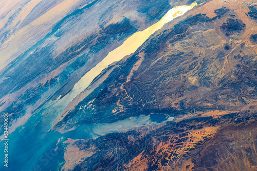 Sunlight reflections over Sinai, Egypt, Middle East. Elements by NASA