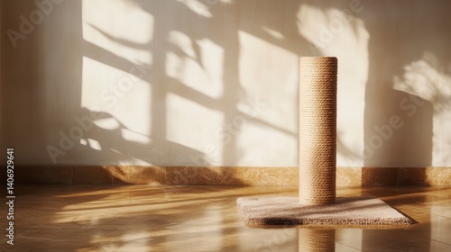 Sunlight streams through window onto a cat scratching post on a rug.