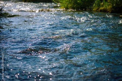 Sunlit blue waves flowing in a summer creek