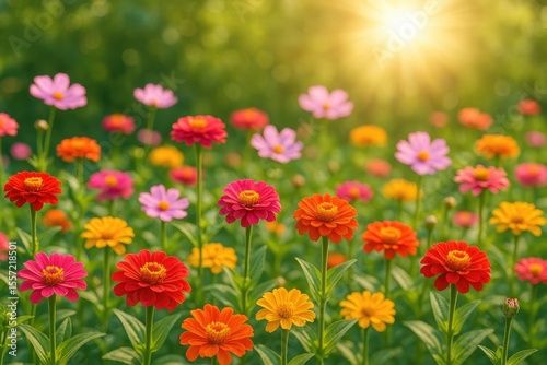 Sunlit garden with blooming flowers