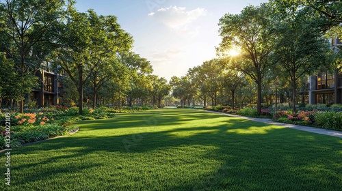 Sunlit park pathway with lush green grass, trees, and modern homes.