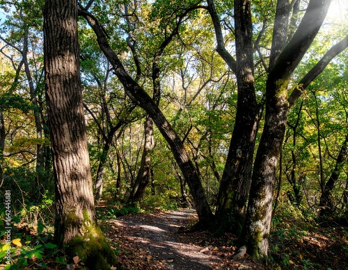 Sunlit path through autumn forest