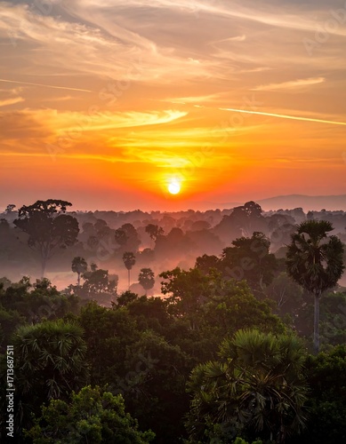 Sunrise over a misty forest