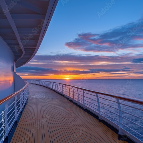 Sunrise over Baltic Sea from cruise ship deck. Stunning colors on horizon. Wooden deck, railing provide perfect spot to watch sunrise. Ocean view. Peaceful atmosphere. Cruise ship. Vacation on ship.