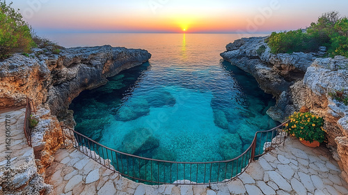 Sunrise over calm sea viewed from stone steps