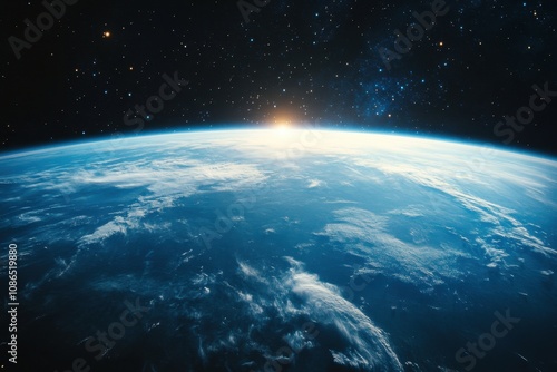 Sunrise over Earth from space, showing a bright sun peeking over the horizon with blue skies and white clouds.