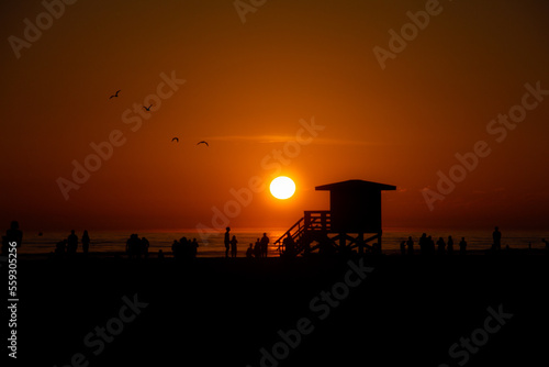 Sunset over beach house with birds
