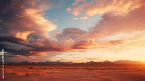 Sunset over Desert with Dramatic Clouds and Distant Mountains
