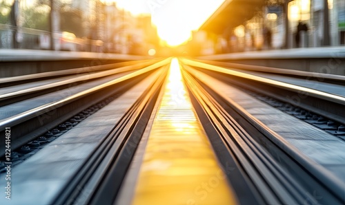 Sunset over empty train tracks at urban station, ideal for travel and transport themes