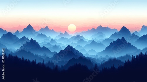Sunset over misty mountain range, serene landscape