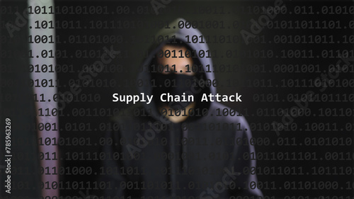 Supply chain attack text in foreground screen, anonymous hacker hidden with hoodie in the blurred background. Vulnerability text in binary system code on editor program.