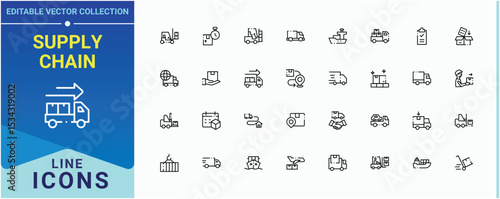 Supply Chain line icon set. It contains symbols to logistic, export, package, pack, logistics, tracking, train. Logistics line icon set. Icons for UI designs. Vector artwork and illustration.