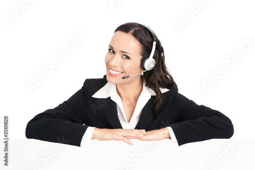 Support phone operator with signboard, isolated
